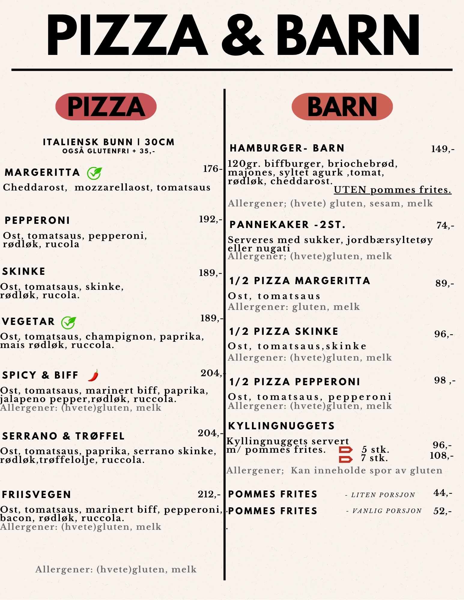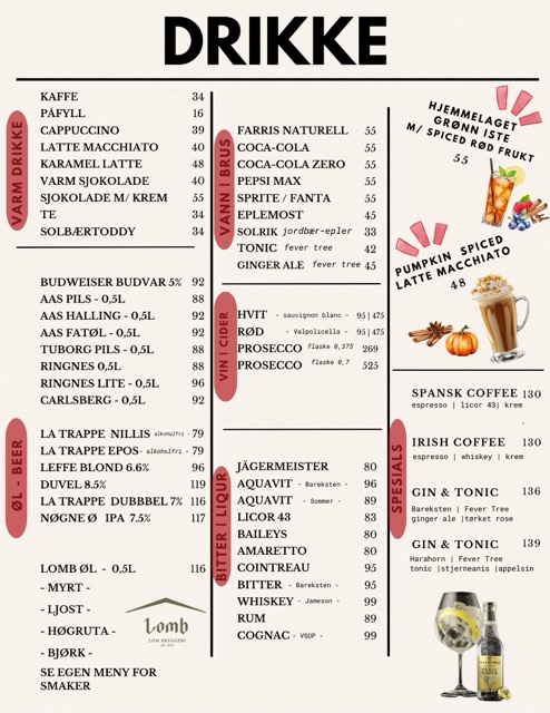 We have a weekly menu with today’s lunch and dinner. The menu is published on our website. We serve international dishes along with traditional Norwegian dishes. During the summer we also have nice picnic benches on our sunny terrace. Here you can enjoy from all the good things.