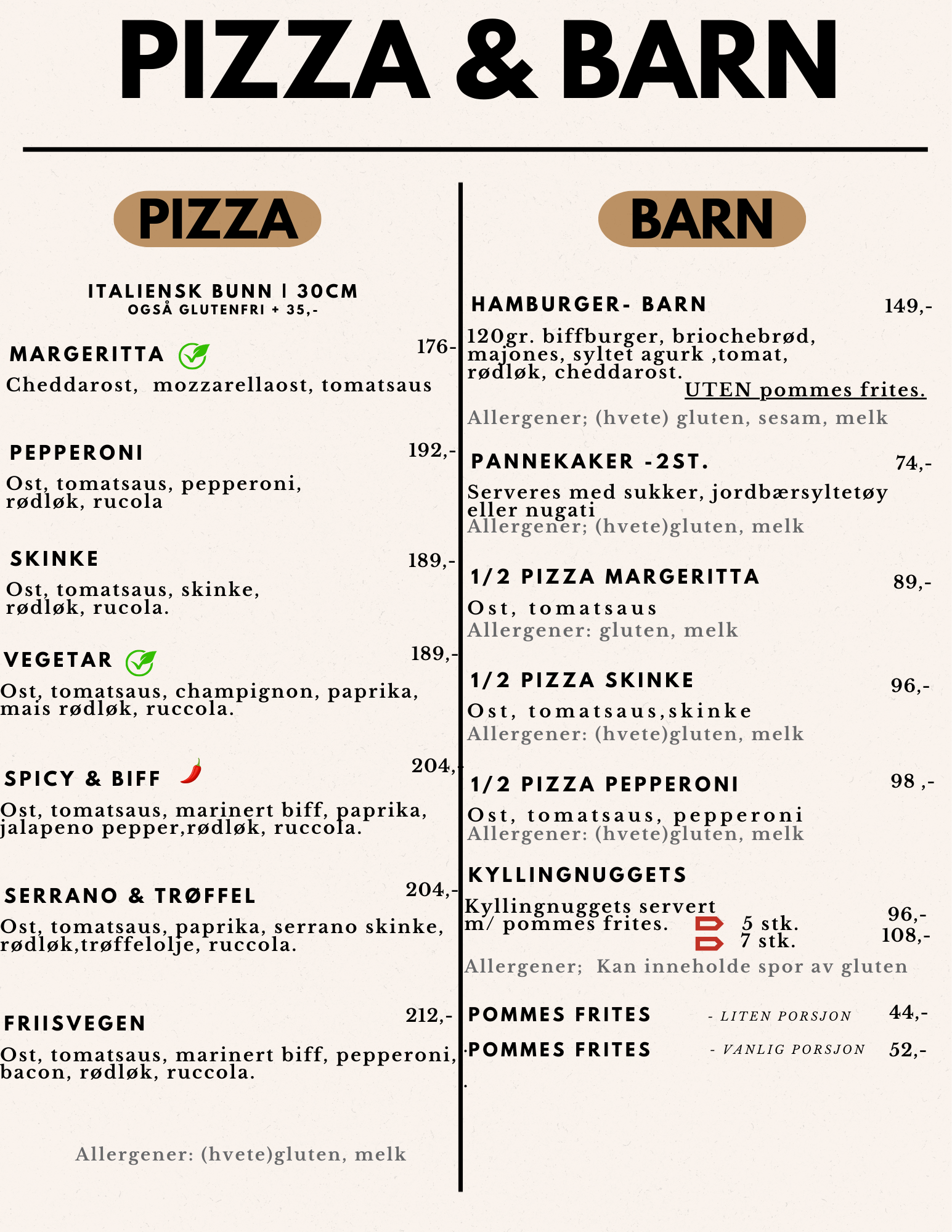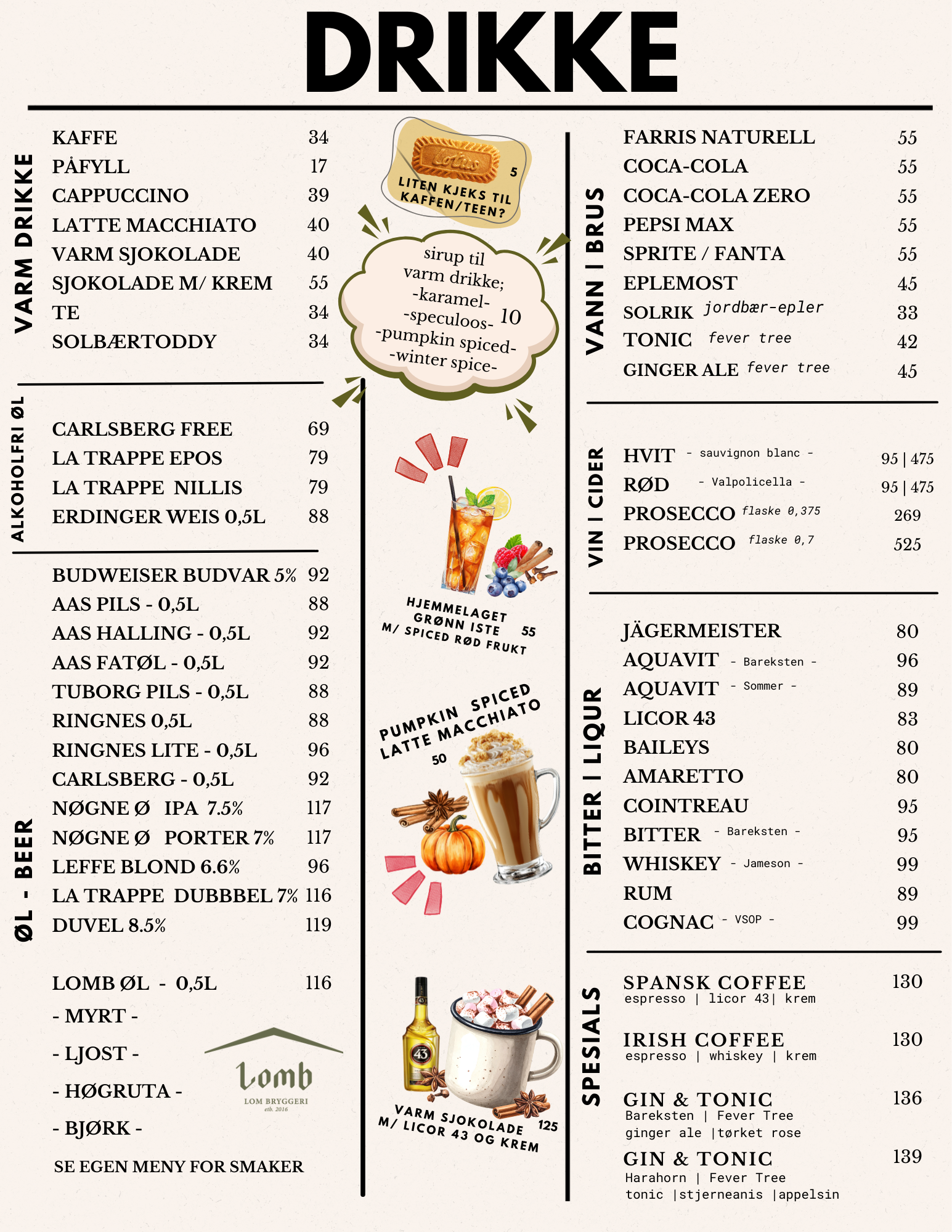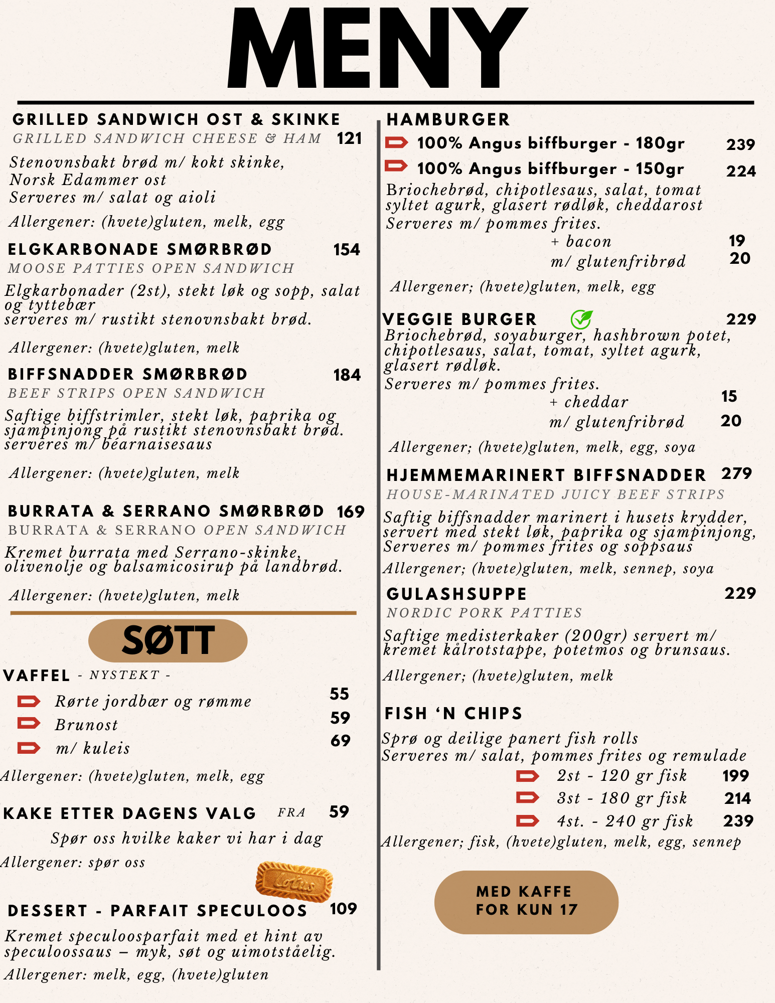 Vi har en uke meny med dagens lunsj og middag. Menyen er publisert på website. Menyen består av tradisjonelle norske retter, sammen med nye mer internasjonale retter. Dere er også velkommen for en god kopp kaffe med kaker og vafler sammen med vennen, familie, kollegaer eller alene.